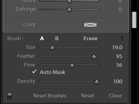 You might well recognise these settings as they are identical to the Adjustment Brush tool. You have two regular painting brushes and an Erase brush. The regular brushes allow you to expand the filter effects to other areas of the image whilst the Erase brush allows you to remove the filter effect from an area.