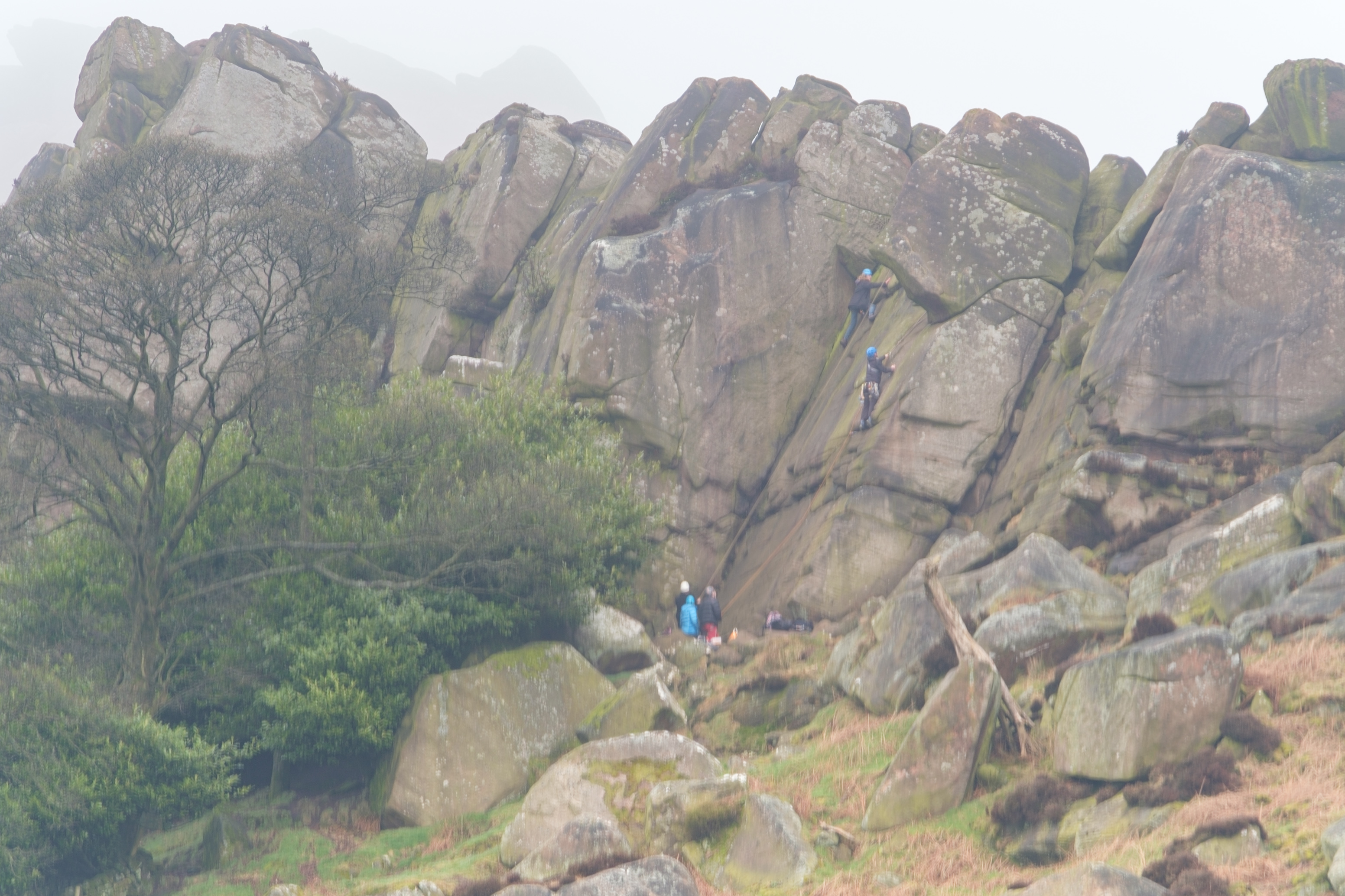 Unfortunately, the location we chose was very foggy and remained so for most of the day. The fog did lift to a certain level but generally it was too dense to use the new lens properly. I did however manage a few test shots of distant rocks which a group of climbers were scaling. I mounter the camera on my tripod and lined up the shot using both the lens and teleconverter. The conditions were still with no wind and I was using a cable release.