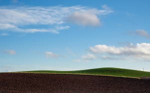 Excellent shot with several important decisions made. The main decision is whether or not to keep as a landscape or an abstract. By including a small slice of the post and odd shaped dirt on the very right side plus a very large slice of sky above, you have chosen to give us a true landscape instead of an abstract involving the rhythm of the three bans of contrasting color of green, tan, and brown. This type of composition and decision making is what reflects a real photographer from just a snapshot taker. A brilliant example of making a powerful and significant image out of an otherwise rather mundane scene. Bravo!