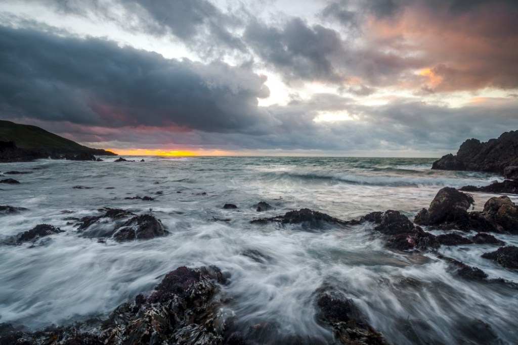 The image was captured using a Nikon D800 and a 0.6 (2 stop) ND grad filter was used to control the exposure of the sky. As you can see, this is a rather drab scene with rocks and seaweed that are too dark, whilst the sea is a little under exposed despite my using the graduated filter. The colour has also been largely removed by the cameras auto white balance setting but this has produce a blue colour cast where the scene was a warmer sunset.
