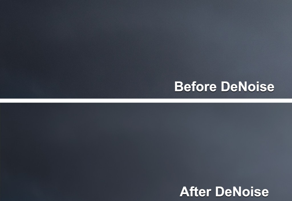 Anyway, I ran the image through DeNoise, and the results amazed me. I know we use superlatives like “amazed” far too often these days, but I can’t think of a better way of describing my surprise. The image was beautifully clean with no trace of noise anywhere. Here is a section of the sky before and after viewed at 200% magnification and then enlarged (x2) to help you see the detail.