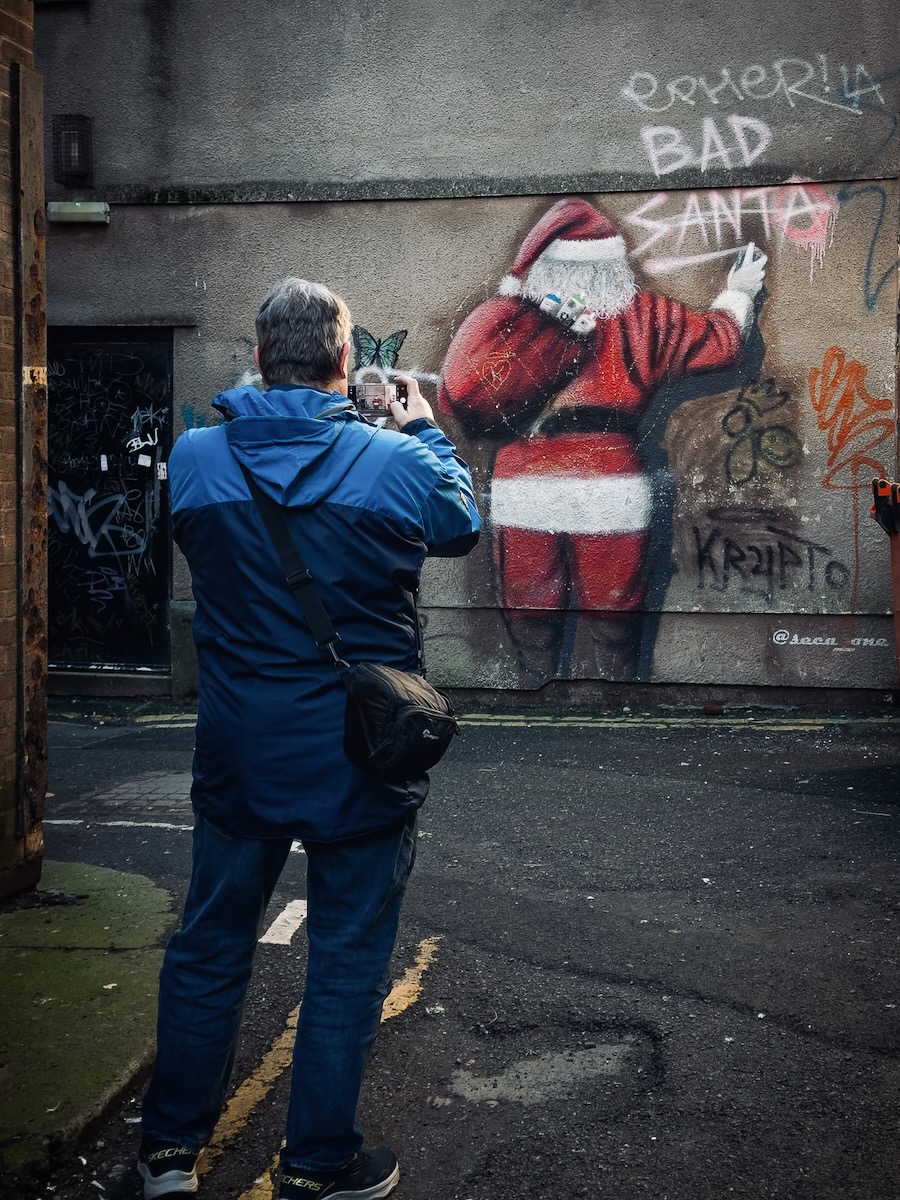 In the afternoon, I headed over to find “Bad Santa”. This is a wonderful piece of graffiti art from someone with a sense of humour. Here’s a shot of my friend photographing it.
